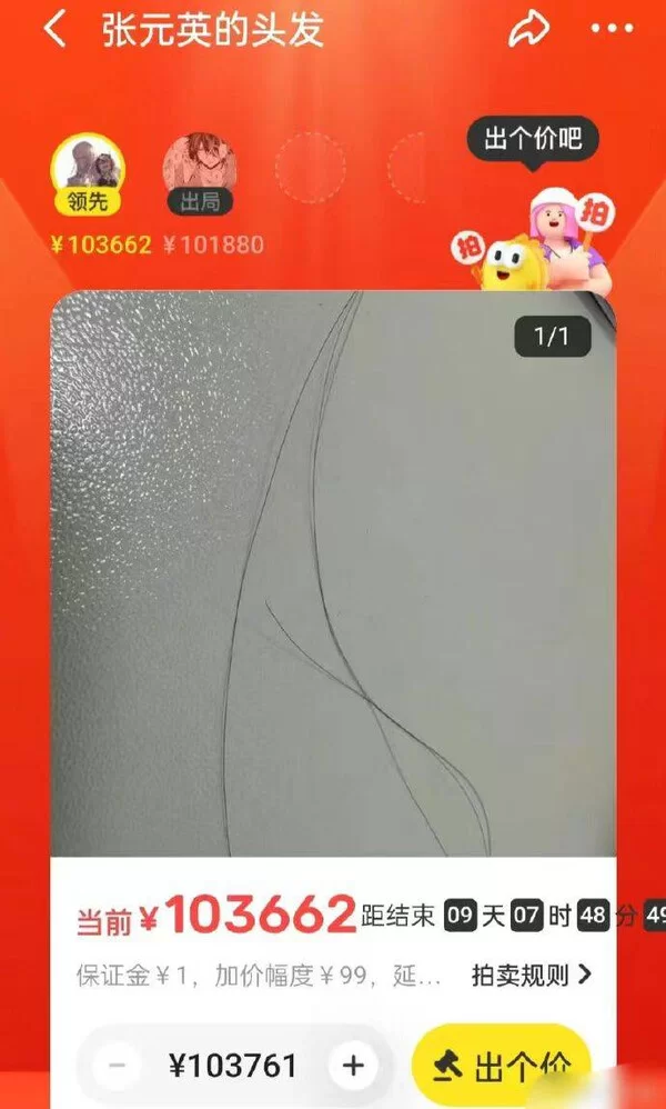Numerous bidders reportedly participated, and the price for the hair supposedly soared to 103,662 yuan (approximately 19.15 million won). The auction is scheduled to end on the 2nd of the next month.