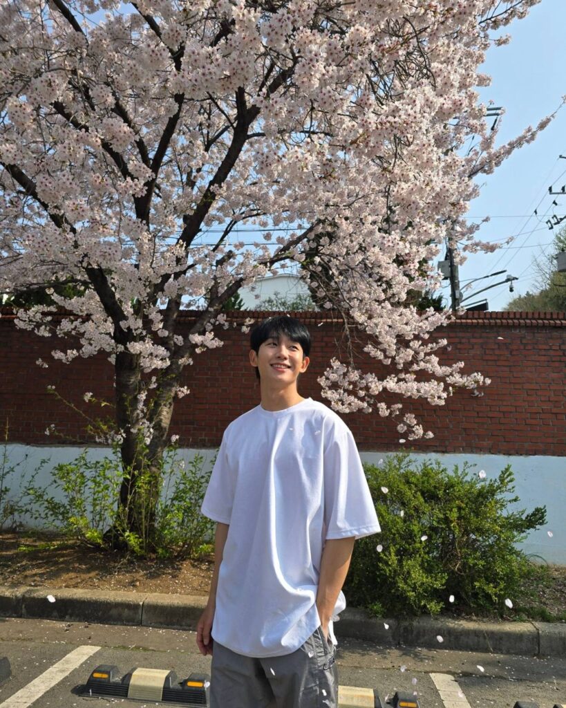 The photos showcase Jung Hae In striking various poses amidst a stunning backdrop of cherry blossoms. His radiant smile, coupled with the fluttering petals, has certainly caught the attention of his fans.