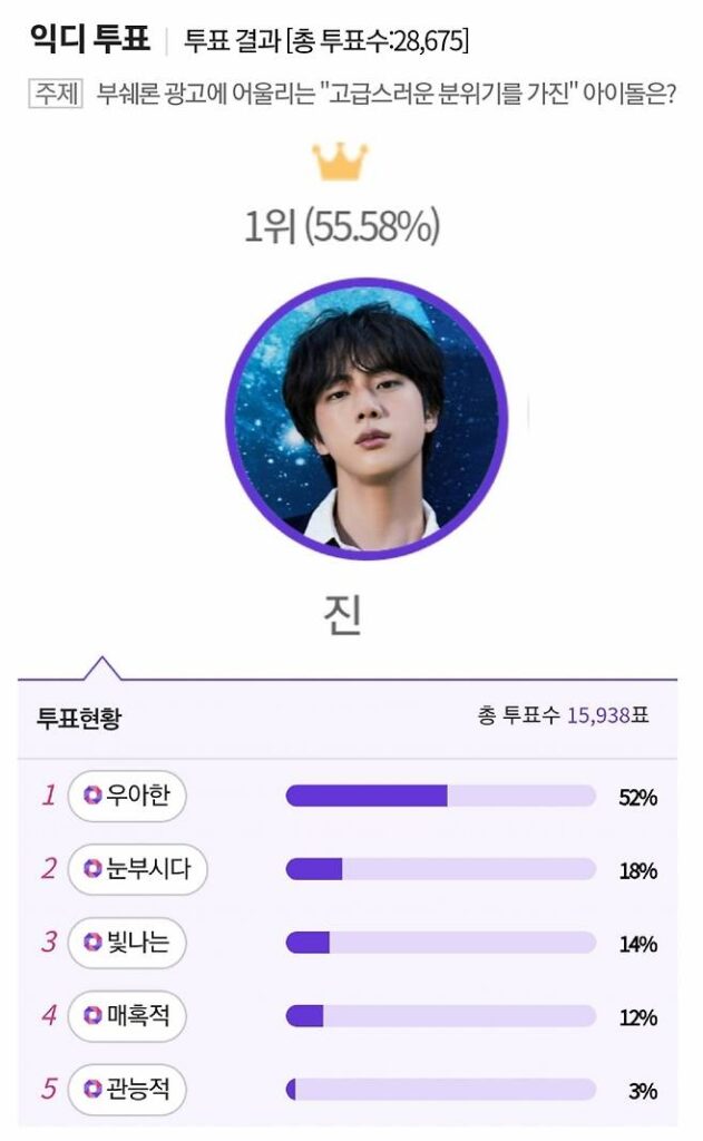 From June 22nd to June 29th, Jin topped Exciting DC's survey as the 'idol fitting for BOUCHERON advertisements with an elegant atmosphere.'