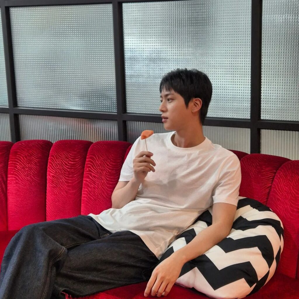 On August 5, Jin shared several selfies on his personal SNS with the caption "Peach." In the photos, Jin is seen enjoying a peach while sitting on a red sofa. His short haircut, noticeable since his recent discharge, caught everyone's eye.