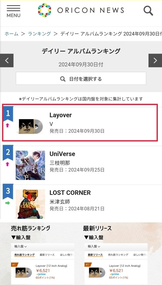 According to the "Daily Album Ranking" chart released by Oricon on September 30, V's Layover LP debuted at No. 1 right after its release in Japan. It also took the top spot in both Amazon Japan’s Imported Albums Sales Ranking and the latest Imported Albums Sales Ranking.