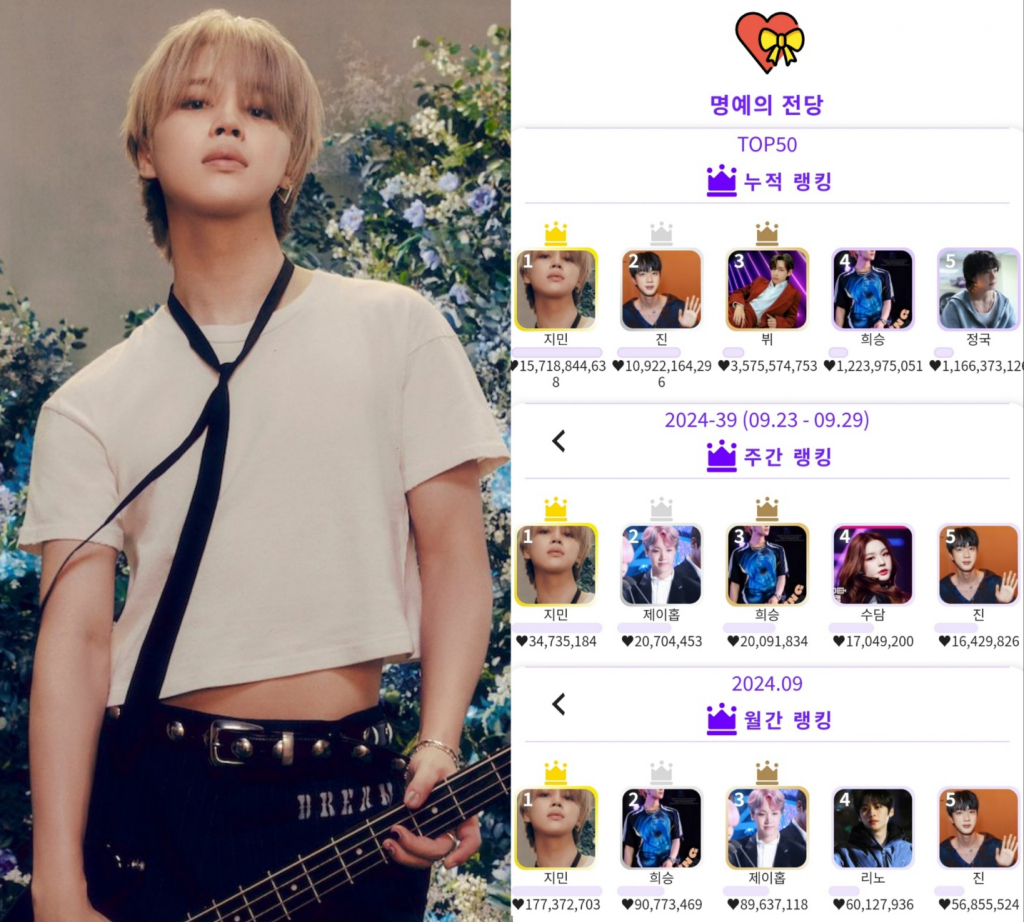 As of October 5, Jimin has a remarkable total of 15,718,844,638 votes, placing him at the top of the K-Dol Hall of Fame with a huge lead over second place.