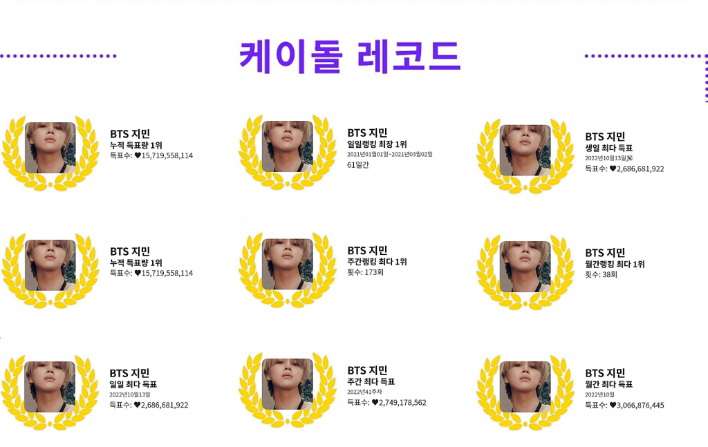 Additionally, Jimin continues to break records with his achievements, including the most cumulative votes (15,718,844,638), the highest daily votes (2,686,681,922) on October 13, 2022, and the highest monthly votes (3,066,877,445). He has also ranked in the top five for the longest daily ranking with 61 days.