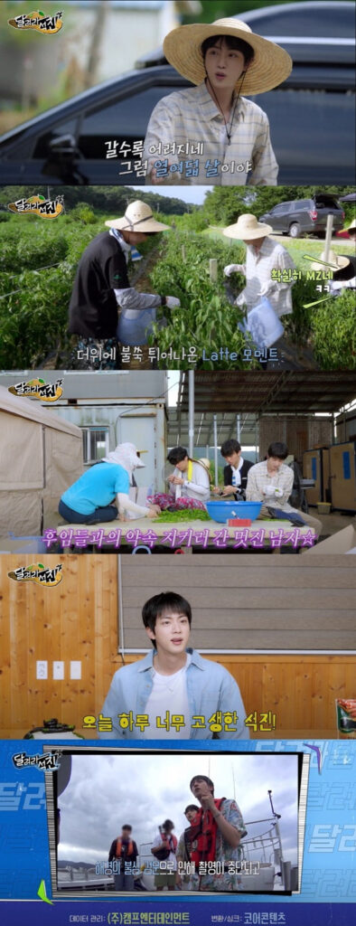 When it was time to get serious and speed up the work, Jin quietly focused on picking peppers under the hot summer sun. The farm owner was impressed with Jin’s speed, even commenting, “He’s definitely faster than the students.” Despite being drenched in sweat, Jin’s visuals stayed flawless, impressing everyone around him.