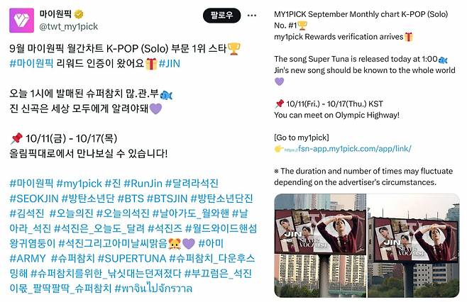 Jin's win adds to his growing list of achievements. He’s been at the top of MY1PICK’s K-pop Individual Category Weekly Ranking for 32 weeks in a row. In September, he had over 25 million hearts and secured first place in the monthly ranking for nine straight months. This success led to another video ad, which will be displayed on Yeouido Olympic Boulevard from October 11 to 17.