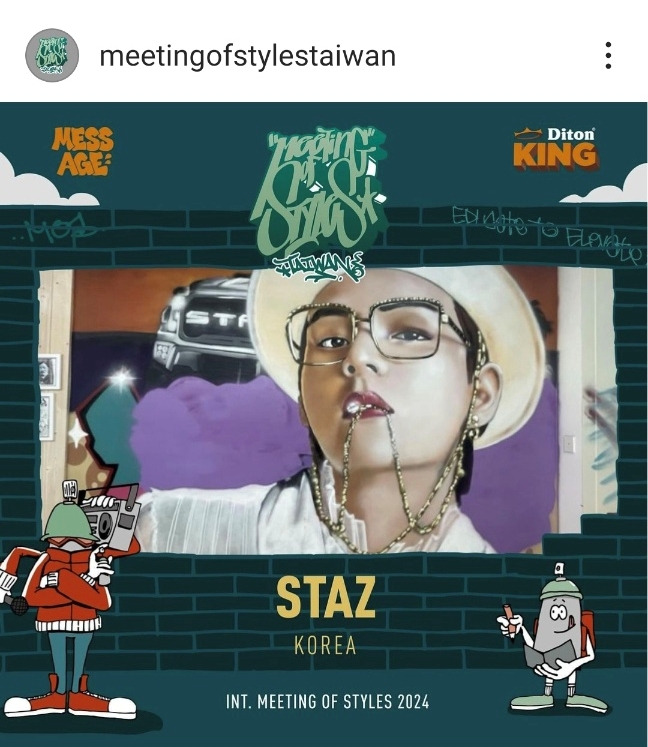 Meeting of Styles is a global network that organizes graffiti festivals in major cities throughout the year. During the festival, artists create their works live and take part in street art activities like dance and DJ battles. Leading up to the event, the artists and their work are introduced through media, with Lee Jong-bae's mural of V featured prominently in the promotional materials.