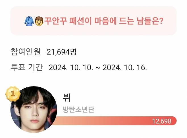 BTS’s V has been recognized as the male idol with the most appealing "effortlessly stylish" fashion, further proving his popularity in the K-pop world. He took the top spot in a recent poll for "Male Idol with the Most Appealing Effortlessly Stylish Fashion," conducted by the K-pop community Choeaedol from October 10 to October 16.