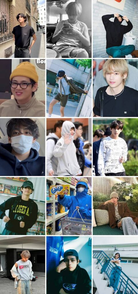 V loves to wear comfortable clothes like hoodies, T-shirts, slacks in natural tones, sweatpants, and loose-fit jackets. As a true fashion icon, he often adds accessories like scarves, glasses, and hats to complete his looks.