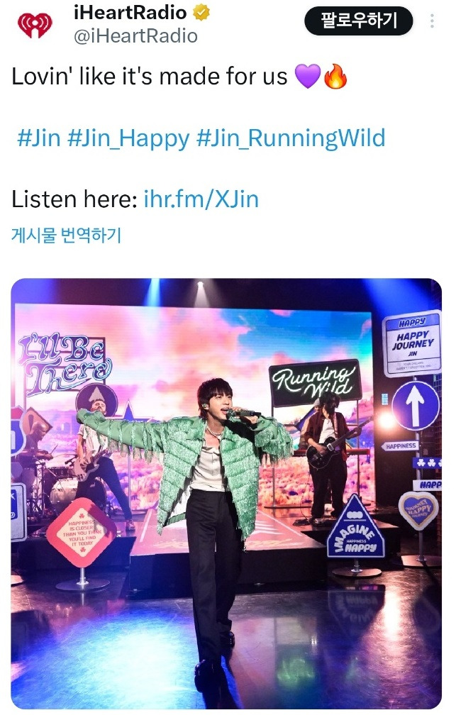 iHeartRadio, the U.S.’s largest radio broadcaster, joined in the praise, sharing photos of Jin and writing, "It’s like it was made for us," accompanied by a purple heart and fire emojis.