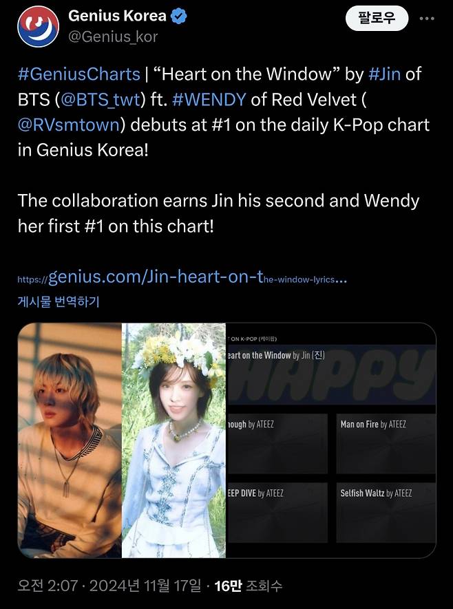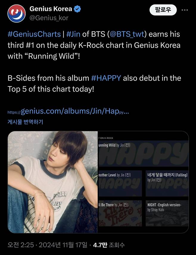The success of these tracks on the Genius Korea chart reflects the strong support Jin is receiving as a solo artist.