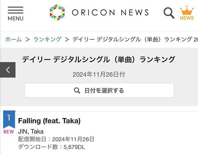 With five No. 1 singles on the Oricon Daily Digital Single Chart, Jin has now secured the second-highest record for a Korean and K-pop artist in this category.