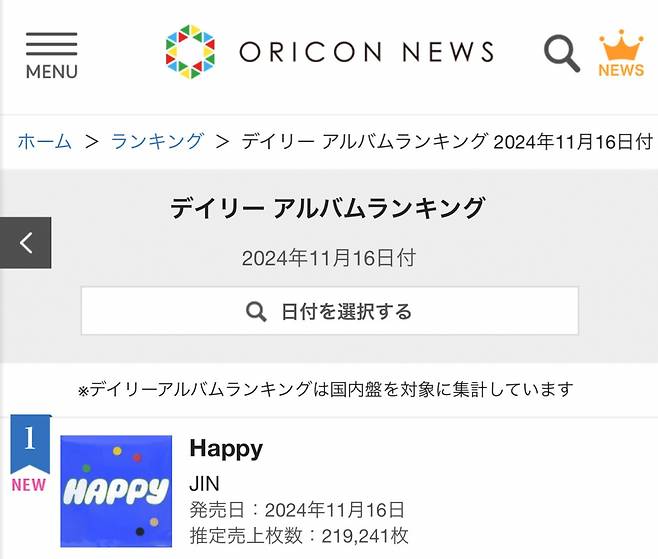 On the Oricon Chart, Happy took #1 on the Weekly Digital Album Ranking for November 11-17, making it the best-selling K-pop solo album on its release day in 2023. In its first week, Happy sold over 219,000 copies in Japan, marking the third-best first-week sales for any K-pop solo artist in Oricon history.