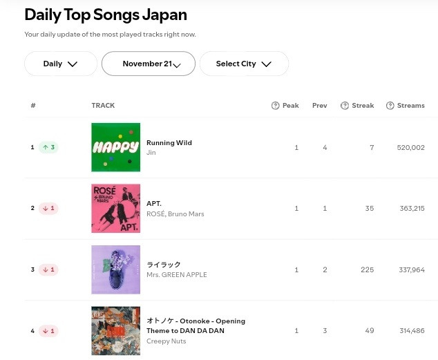 Jin's album also crushed it on Deezer Japan’s Top 100 Chart, with Running Wild at #1, followed by tracks like Nege Dwal Tekkaji (feat. Taka) at #2, and I’ll Be There at #3. Several other tracks from Happy made the top 10, showing just how much fans love Jin's music.