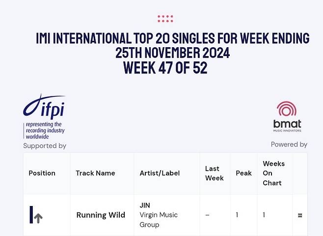 Jin’s Running Wild also reached #1 on Spotify Japan's Daily Top Songs Chart and ranked #6 globally. The album hit #1 on China’s Apple Music and QQ Music charts, showing its massive popularity not just in South Korea and the U.S., but also in Japan and China.