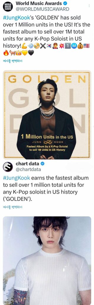 Released in November 2023, GOLDEN has made an incredible impact. It became the fastest K-pop solo album to sell more than 1 million copies in the U.S., the world’s largest music market. This impressive achievement is even more remarkable considering GOLDEN is Jungkook’s very first solo album.