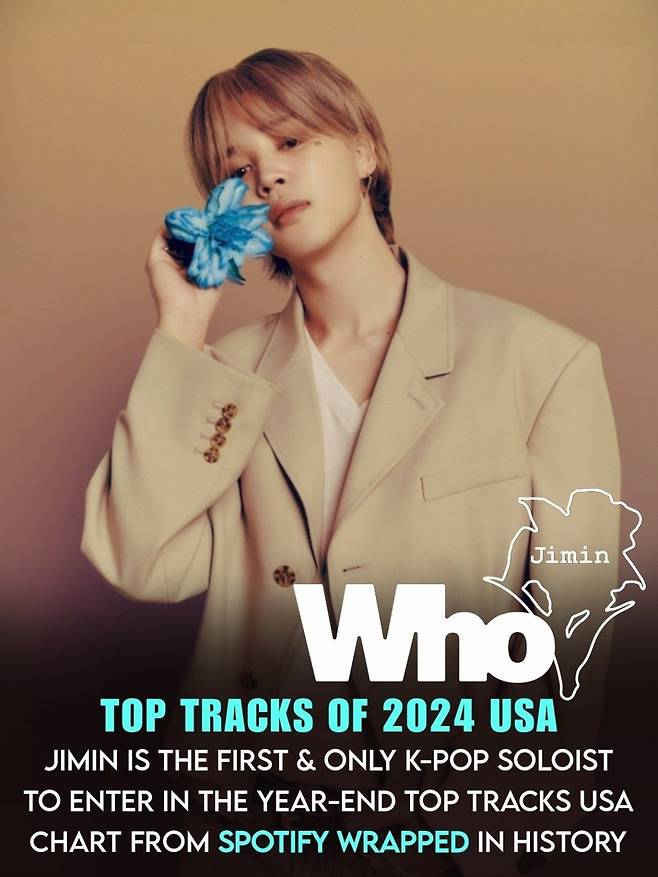For the first time ever, a song by a Korean solo artist made it onto the "Top Tracks of 2024 USA" list on Spotify Wrapped. Jimin's solo second album "MUSE" and its title track "Who" ranked 46th on the chart, making Jimin the first K-pop solo artist to land this achievement. Talk about a game changer!