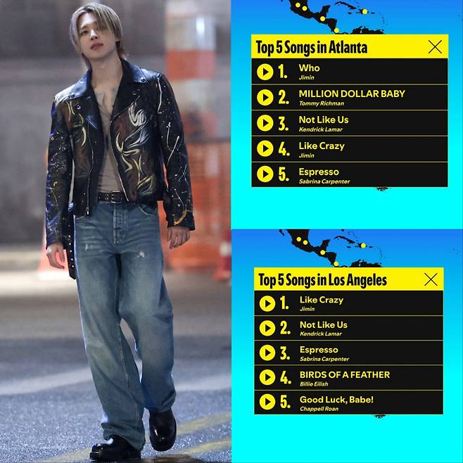 But that’s not all—Jimin's hit song "Who" topped the Atlanta city chart, and his previous smash "Like Crazy" from his first album "FACE" clinched the top spot in Los Angeles. It’s clear that Jimin’s influence as the most-streamed K-pop artist in the U.S. is undeniable.