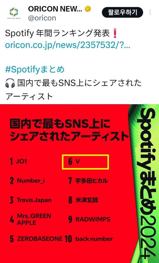 According to Oricon News, V achieved an impressive 6th place in the 'Most Shared Artists on SNS in Japan' category in the '2024 Annual Rankings' by Spotify Japan. This marks the highest position ever for any K-Pop solo artist on this list, showcasing just how popular V is, even while he is currently on hiatus for his military service.
