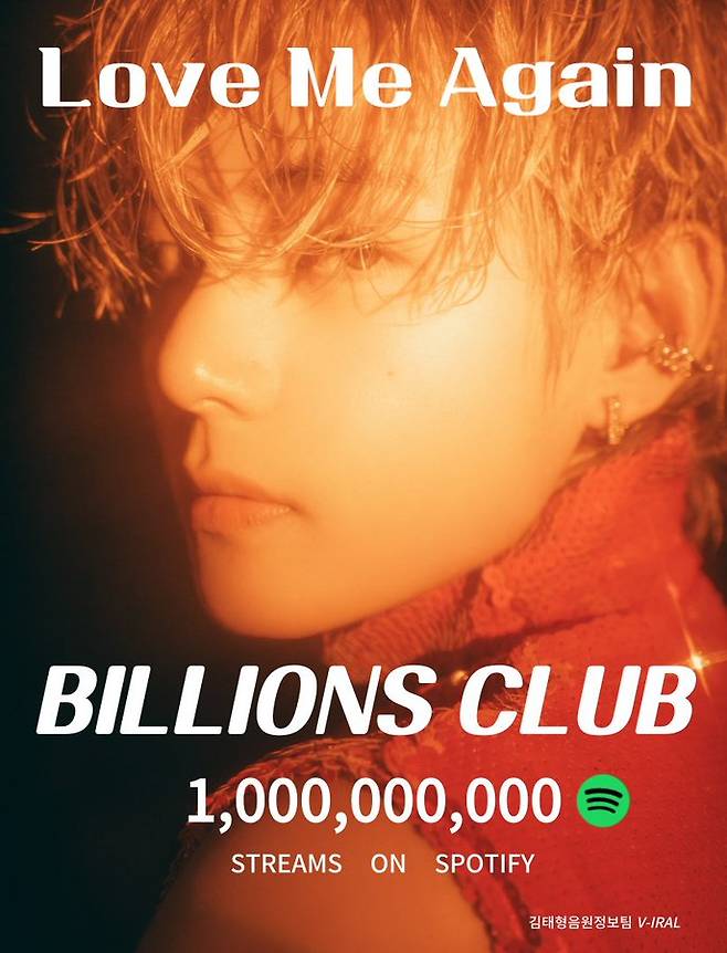 BTS's V has just achieved an incredible milestone, with his song Love Me Again crossing 1 billion streams on Spotify! This makes it the first-ever K-pop B-side track to join Spotify's exclusive "Billions Club."