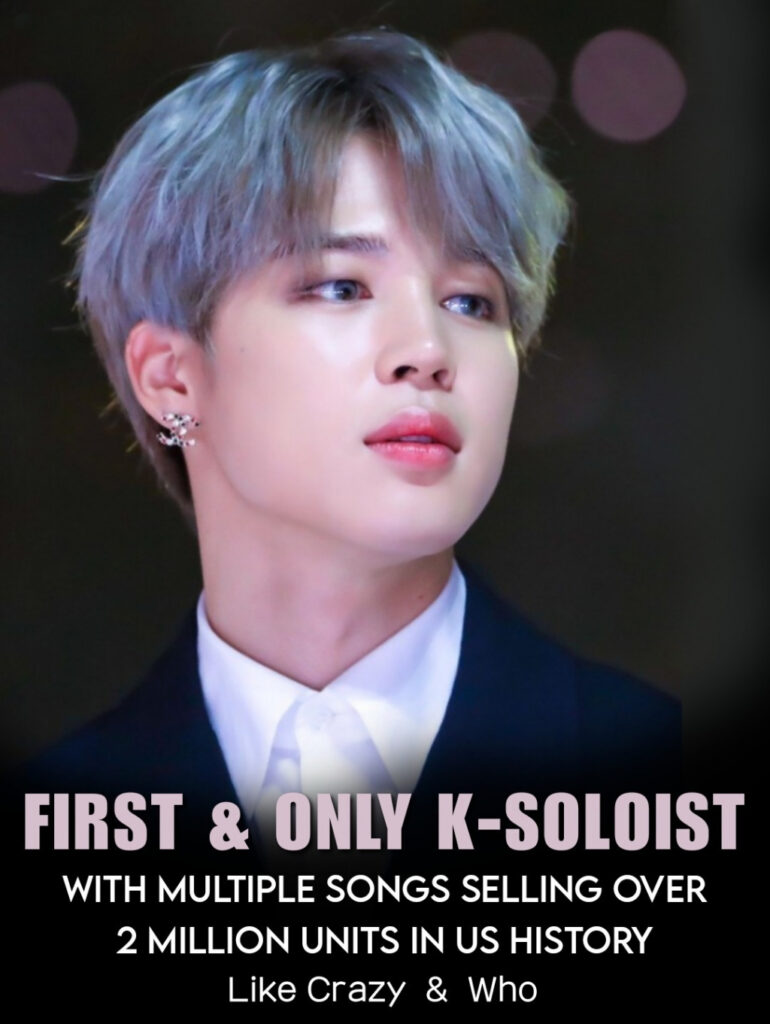 What makes this even more remarkable? Jimin is the first and only K-pop solo artist to have two songs with double platinum certifications. His first solo album FACE also achieved this when the title track “Like Crazy” surpassed 2 million units last year.