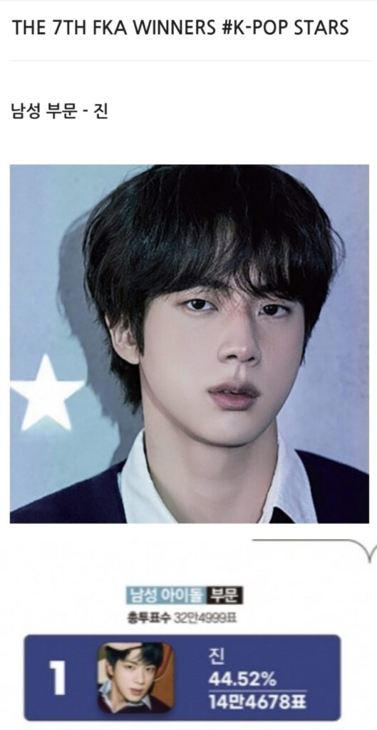 Competing against other top idols, Jin came out on top in the male idol category, securing an impressive 44.52% of the total votes—an astounding 144,678 votes in the final round!