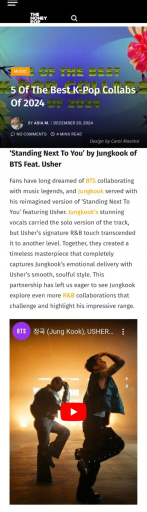 BTS member Jungkook continues to make waves around the world as his collaboration with Usher, Standing Next to You – Usher Remix, was recently named one of the Top 5 Best K-Pop Collaborations of 2024 by U.S. pop culture magazine The Honey Pop.