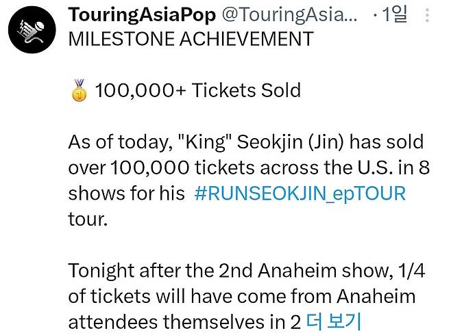 To top it off, Jin is now one of only three BTS members to have sold over 100,000 tickets in the U.S. as a soloist—and he did it with only eight shows, the fewest number among the three.