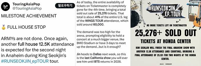 TouringAsiaPop praised him as “King Seok Jin” and confirmed that Jin’s concerts marked a new record at the Honda Center, making it the most attended K-pop solo show ever held at the venue. He also became the first Korean artist to sell out two nights in a row there, and his show is now considered the best-selling BTS-related concert in the U.S. since their 2017 WINGS TOUR.