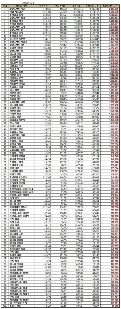 Compared to June, overall idol brand data fell by 13.64%, with drops seen in consumption, media coverage, and fan interactions.