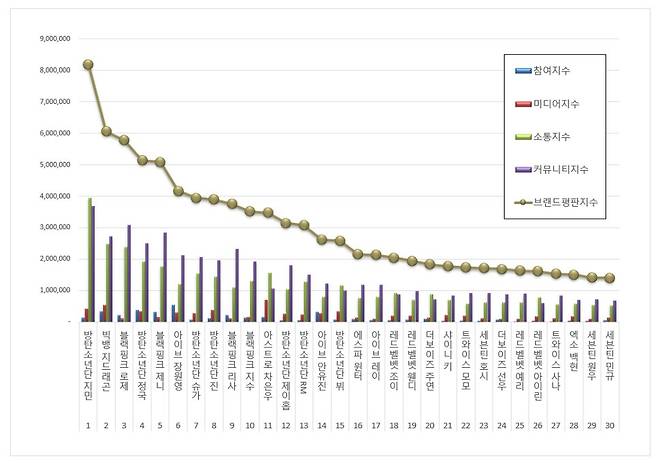 The rankings are based on 140.53 million pieces of big data covering 1,730 idols, measuring four major factors: participation, media, communication, and community engagement.