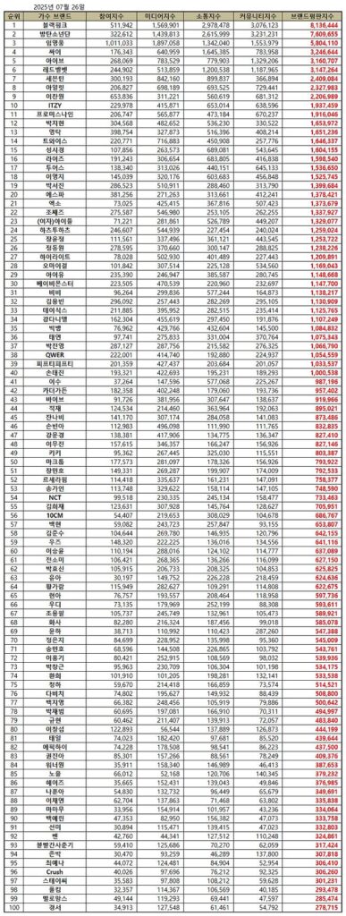 From June 26 to July 26, the institute analyzed over 115 million pieces of data, checking each singer’s popularity in media, online communities, communication, and fan engagement. Compared to June’s numbers, the data volume increased by 7.87%, showing growing interest in K-pop stars.