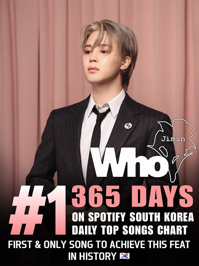 On the Spotify Korea Weekly Top Songs chart, “Who” also became the only song to stay No.1 for 52 weeks in a row (a full year) — a record no other track has achieved before.