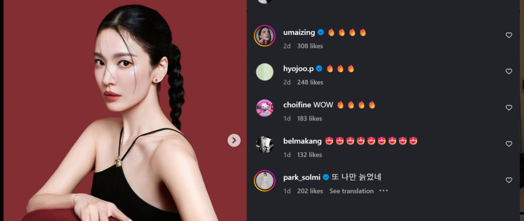 In the photos, Song Hye Kyo wore her hair in a sleek braid and posed confidently in a black dress with bold red makeup and gold detailing on the chest. Her glowing skin, sharp features, and graceful shoulders immediately caught fans’ attention.