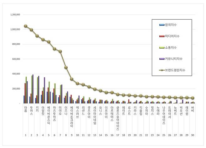 Girl group KiiiKiii took 3rd place with 914,670 points, though their score dropped by 27.74% compared to July. Members Ji Yu, Lee Sol, Soo Yi, Ha Eum, and Ki Ya continue to attract attention with their charm and style.