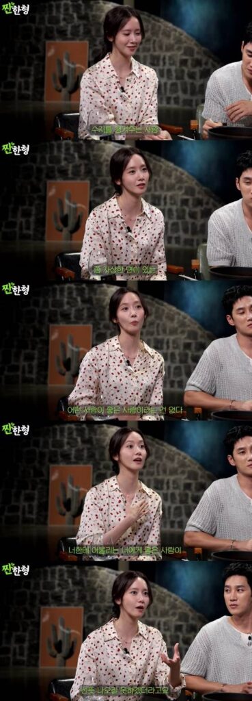 But she explained that her thinking changed after a deep conversation with Shin Dong Yeob. “I once asked you, ‘What kind of person is a good person?’ And you told me, ‘There’s no exact answer. You need to know yourself first—only then can you figure out who suits you.’ After that, I haven’t been able to easily answer questions about my ideal type.”