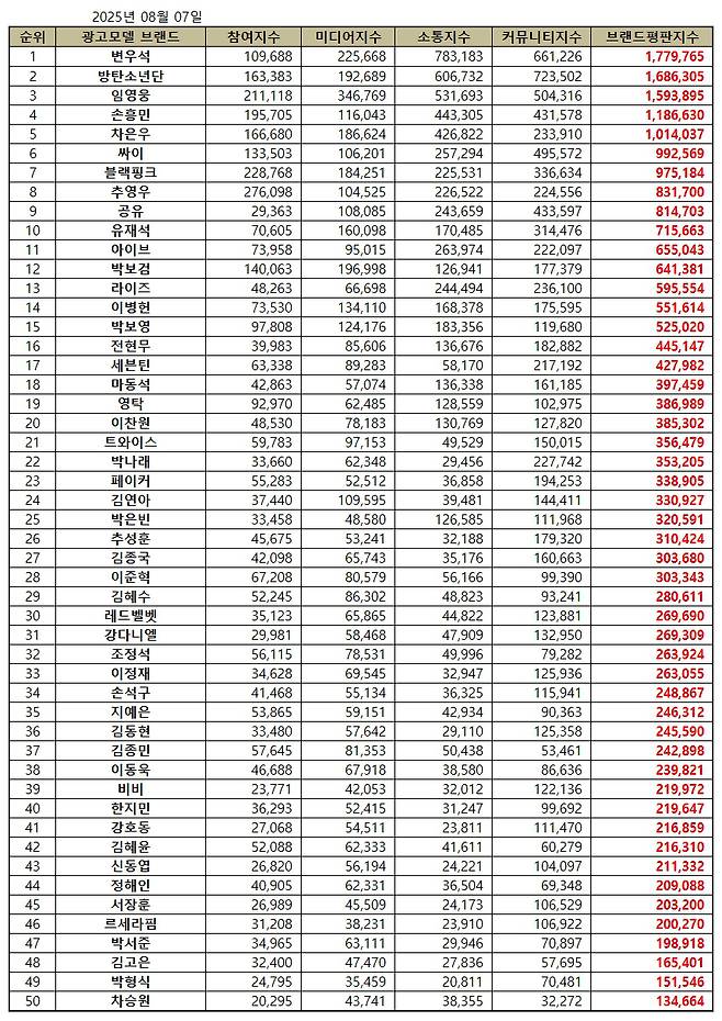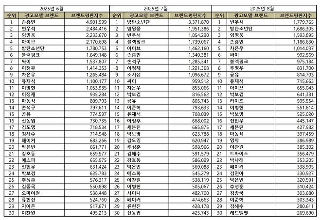 The Korea Corporate Reputation Research Institute revealed the latest rankings based on big data collected from July 7 to August 7, 2025. The analysis looked into how much attention advertising models received across four areas — participation, media coverage, communication, and community engagement. In total, 24,136,784 pieces of data were reviewed, showing a 29.60% drop compared to July.