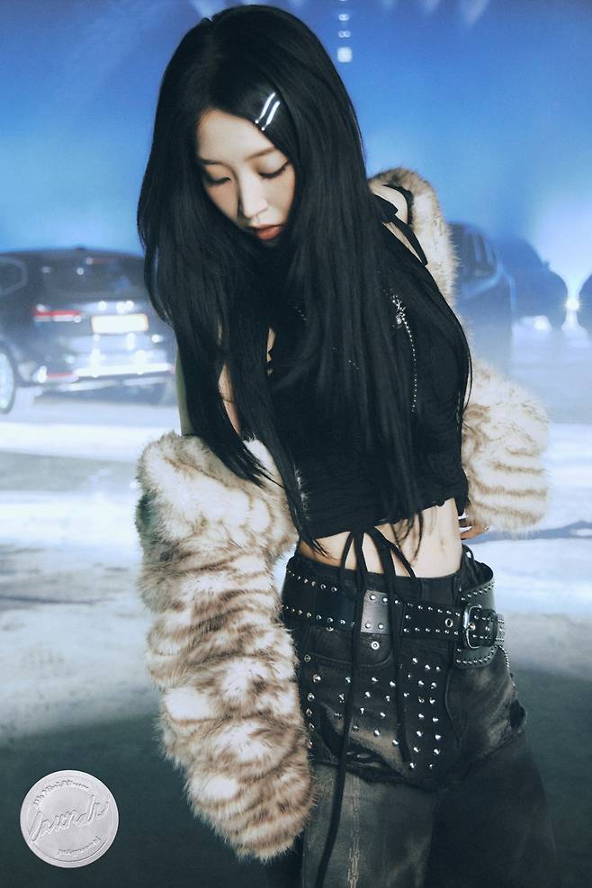 In the photo, Moonbyul rocks a fancy fur jacket, pants with shining stud details, and silver accessories that give off a super chic and confident feel. She’s also wearing blue contact lenses that add a touch of mystery, while the use of a car side mirror in the shot gives the teaser a creative edge.