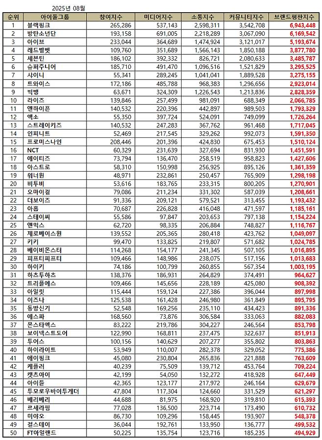 The Korea Corporate Reputation Research Institute analyzed 81,038,147 pieces of big data on idol group brands from July 15 to August 15 — a 13.55% increase compared to last month’s 71,366,509 pieces. The brand reputation index is based on big data analysis measuring consumer engagement, media coverage, communication, and community buzz for both boy groups and girl groups.