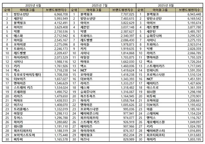 BLACKPINK has once again claimed the top spot in the August 2025 Idol Group Brand Reputation rankings, with BTS in second place and IVE in third.