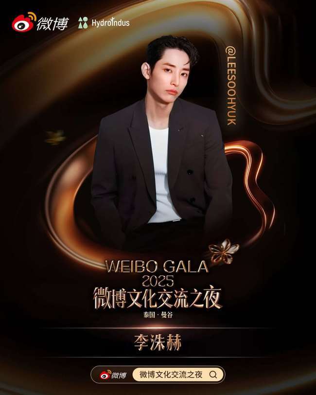 The 2025 Weibo Cultural Exchange Night, featuring Lee Soo Hyuk, will be held on August 16 at the Queen Sirikit National Convention Center in Bangkok and will be streamed live worldwide via Weibo.