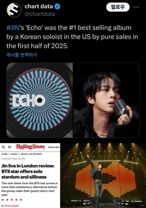 Jin’s Echo world tour has been equally historic — breaking the highest attendance record at Anaheim’s Honda Center, selling out every show, and becoming the first K-pop soloist to hold a concert at London’s O2 Arena. Rolling Stone UK even gave him a perfect 5-star review, calling him “a one-of-a-kind, unrivaled entertainer.”