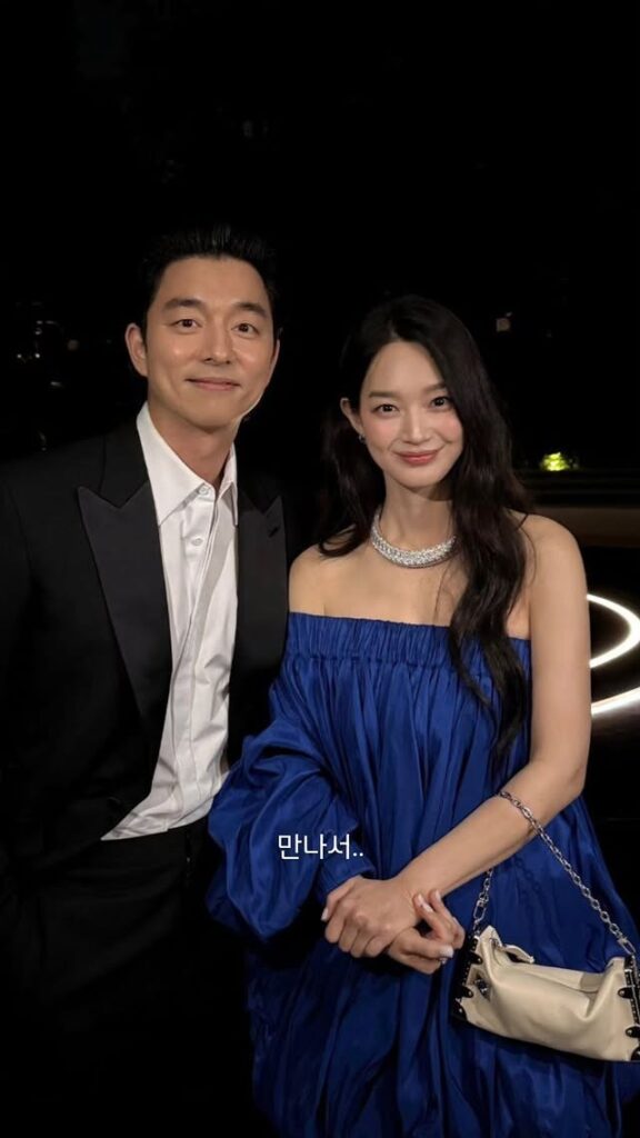 The photos were taken at the brand’s photo wall on August 22, where the two stars met. Gong Yoo looked chic in a classic black suit with a white shirt, while Shin Min Ah turned heads in a balloon-style blue off-shoulder dress, perfectly balancing elegance and cuteness.