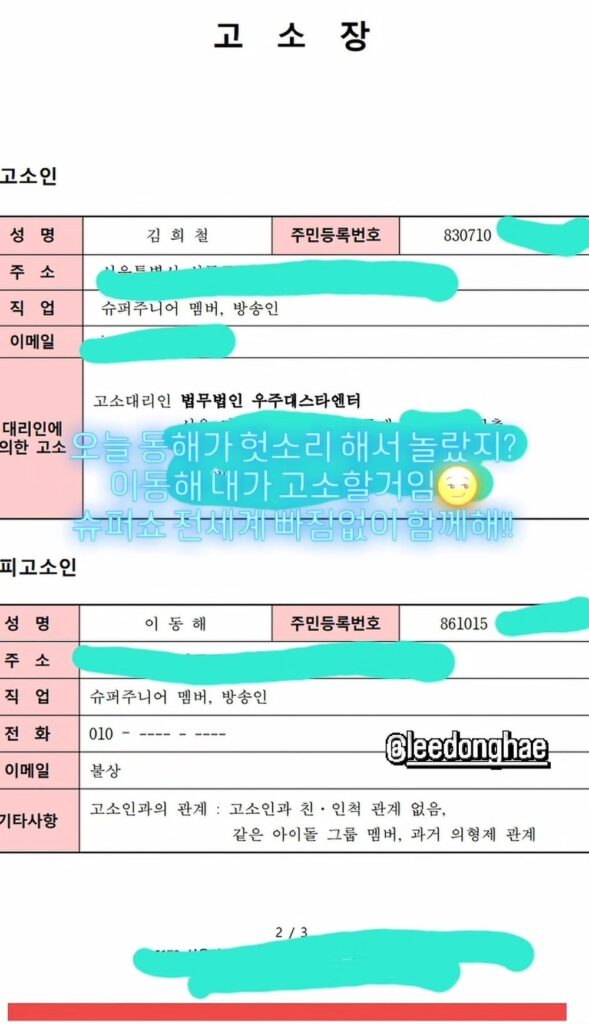 On August 23, Kim Hee Chul shared a mock complaint form on social media targeting Dong Hae. The form humorously listed: