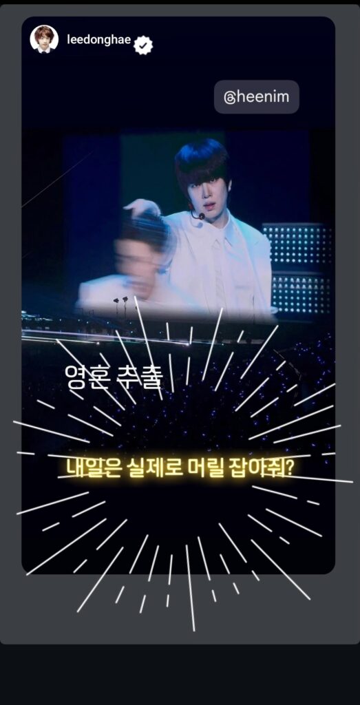 He also uploaded a funny picture Dong Hae had posted earlier, where Kim Hee Chul’s head looked like it was being shaken by his own hand during a performance. He added, “Should I actually grab your head tomorrow?”