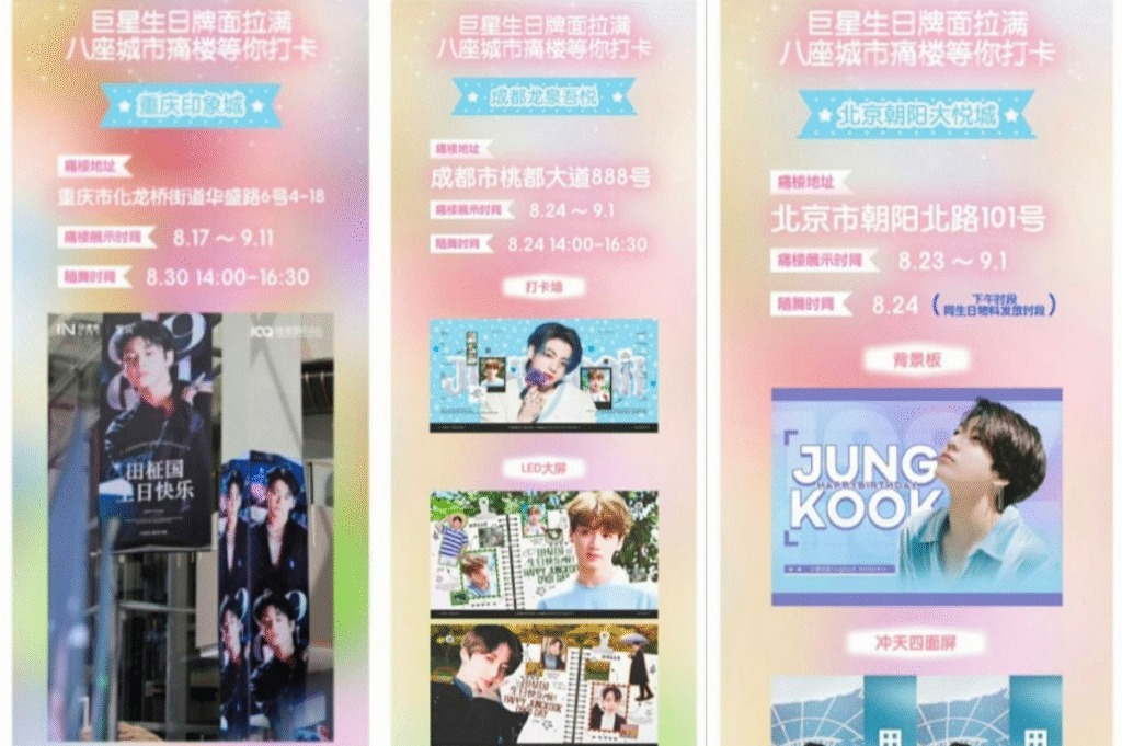 The celebrations don’t stop there. Jungkook China is also holding birthday exhibitions in 8 major Chinese cities — Shanghai, Beijing, Chongqing, Hangzhou, Taiwan, Chengdu, Shenzhen, and Shaoxing.