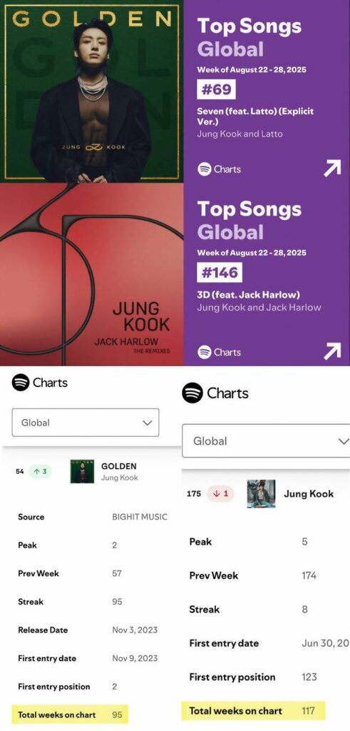 Meanwhile, his debut solo album GOLDEN also continued its impressive run. It ranked No. 54 on the Spotify Weekly Top Albums Global chart for the same period, now marking 95 weeks on the chart—another all-time record for an Asian soloist.