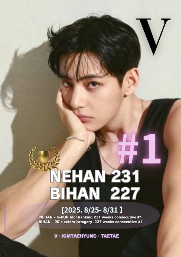 From August 25 to August 31, V ranked No. 1 for the 231st consecutive week on Japan’s idol ranking site NEHAN. At the same time, he also topped the 20s Korean actor category on BIHAN for the 227th week in a row.