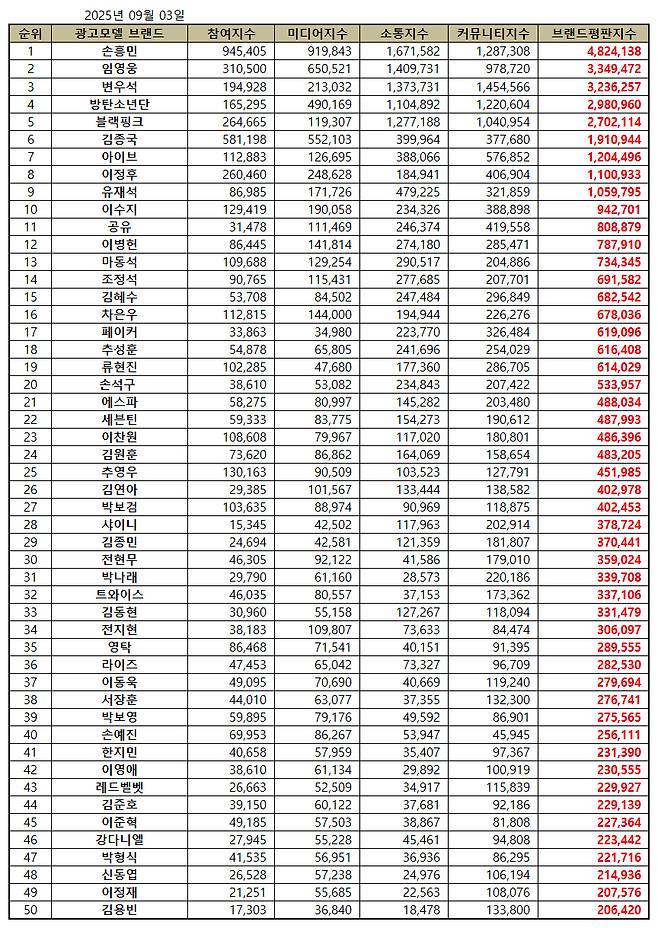 The institute’s head, Koo Chang Hwan, explained, “In September 2025, Son Heung Min ranked No. 1 in advertising model brand reputation. Compared to August, the overall data increased significantly, especially in communication, which rose by nearly 95%.”