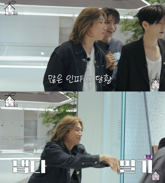 Together, they went to the cafeteria inside the new building. When Daesung saw the crowd of people, he hesitated and joked, “Is this okay? Can I go in?” while pushing Junkyu ahead of him to lead the way.