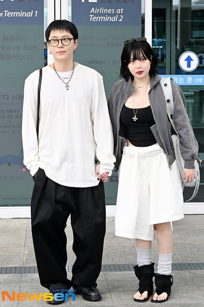 HyunA wore a black crop top, gray hoodie, and white pants, while Yong Jun Hyung kept it casual in a white T-shirt and black wide pants.